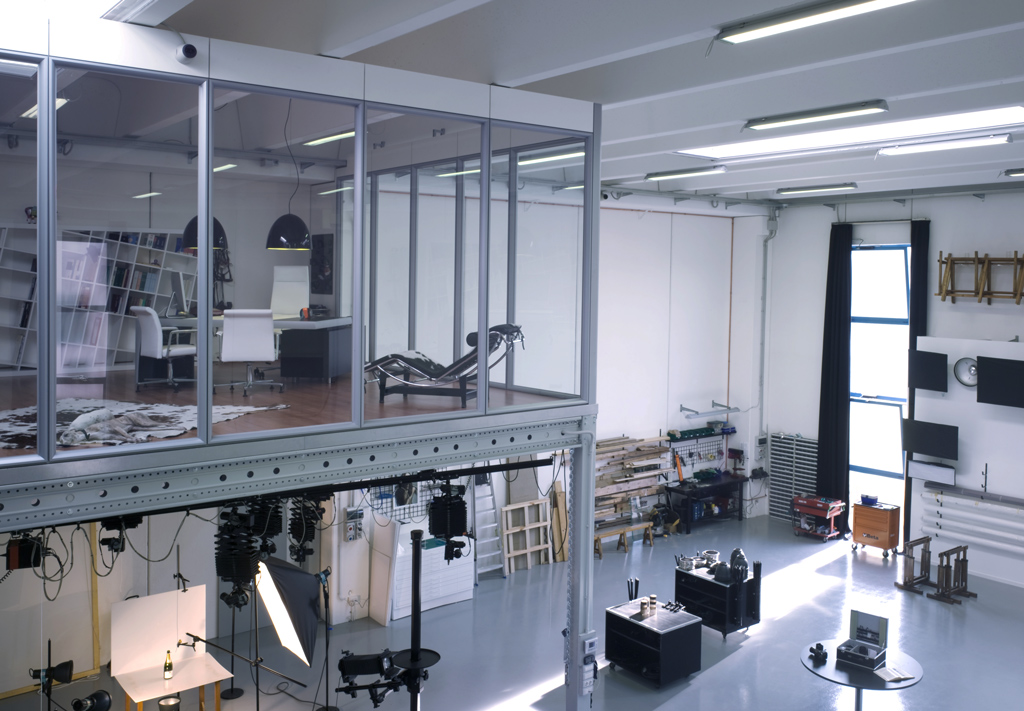 All' interno dello studio è presente un soppalco molto scenico a 380 cm da terra, con una scala di accesso in acciaio e vetro; il soppalco ha un pavimento di parquet un tavolo in cristallo e acciaio di Tobia scarpa illuminato da 24 lampade a cono Flos, di una poltrona nera di cassina seduta singola, di un divano bianco in pelle, questo spazio può essere utilizzati per shooting di portfolio , workshop e piccoli eventi, la dimensione complessiba dello spazio è di 80 m2 ed è provvisto di TV led per proiezioni.